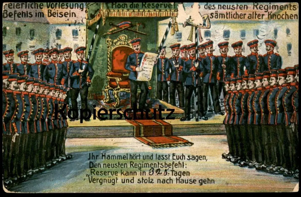 ALTE POSTKARTE SOLDATEN RESERVE FEIERLICHE VORLESUNG DES NEUSTEN REGIMENTS-BEFEHLS IM BEISEIN SÄMTLICHER ALTER KNOCHEN IHR HAMMEL HÖRT UND LASST EUCH SAGEN, DEN NEUSTEN REGIMENTSBEFEHL: RESERVE KANN IN X TAGEN VERGNÜGT UND STOLZ NACH HAUSE GEHN.Verlag: Noever & Co., Dresden