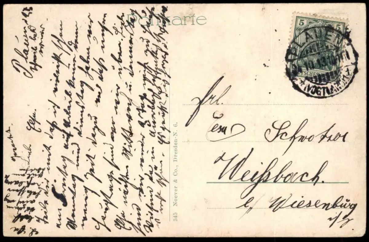 Gelaufen: 24.10.1913 mit Stempel Plauen nach Weissbach bei Wiesenburg (Wildenfels) Sachsen