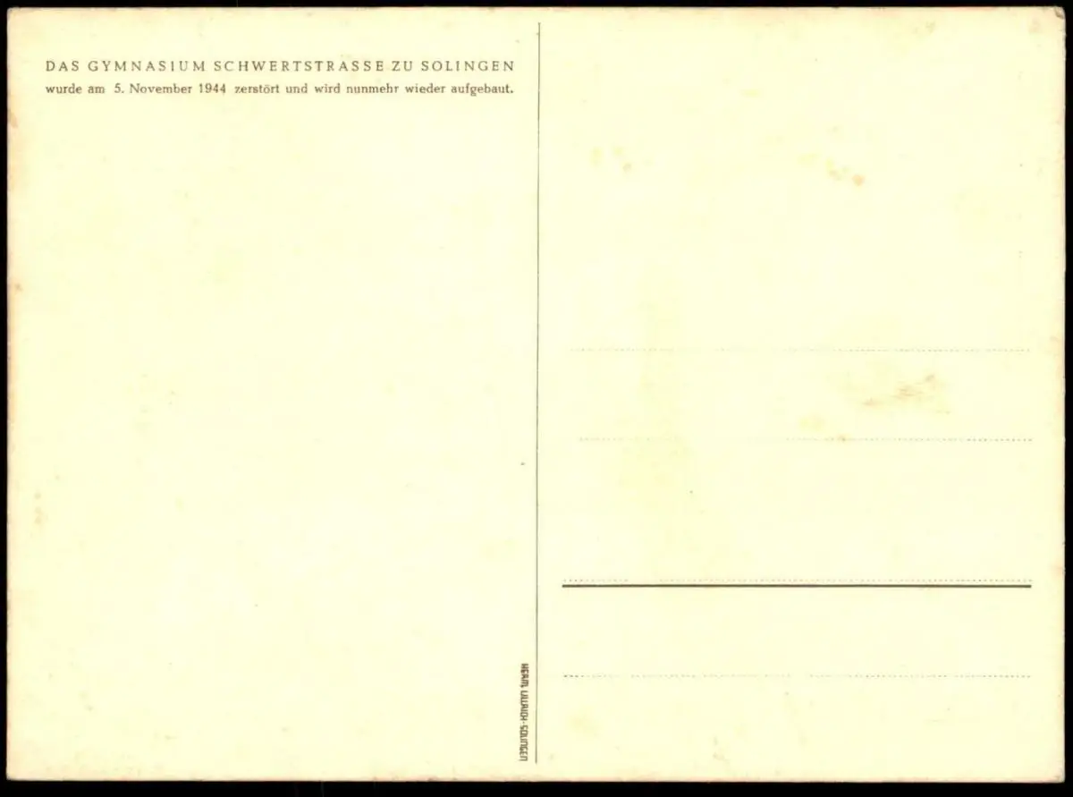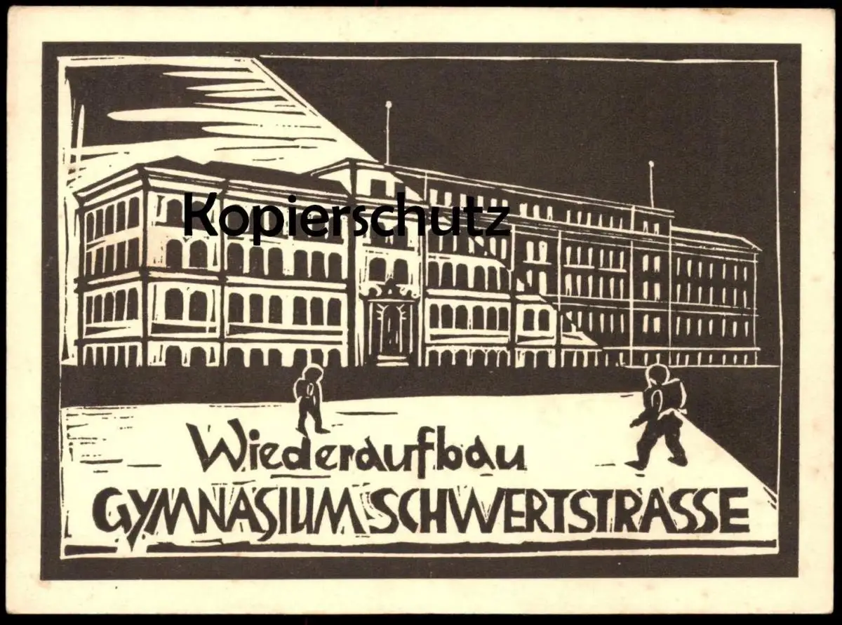 ALTE POSTKARTE SOLINGEN WIEDERAUFBAU GYMNASIUM SCHWERTSTRASSE ZERSTÖRT 1944 Linolschnitt Linol AK Ansichtskarte postcard
