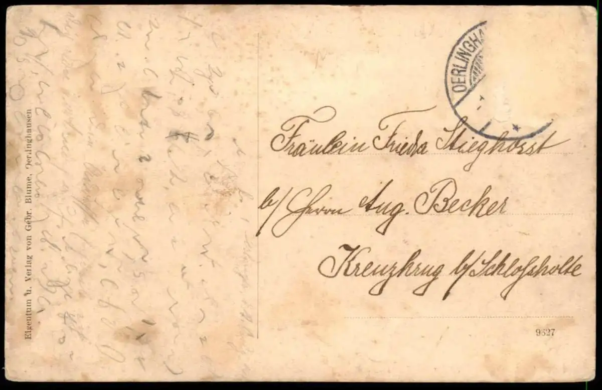 Gelaufen: 01.08.191x mit Stempel Oerlinghausen nach Keruzkrug bei Schloß Holte-Stukenbrock, Briefmarke (sauber) entfernt; Text vermutlich Stenographie
