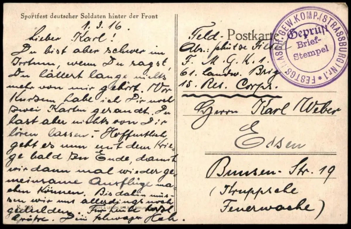 Gelaufen: 01.03.1916 als Feldpost mit Stempel Strassburg nach Essen Krupp´sche FeuerwacheErhaltung (s. Scan): gut / 915603