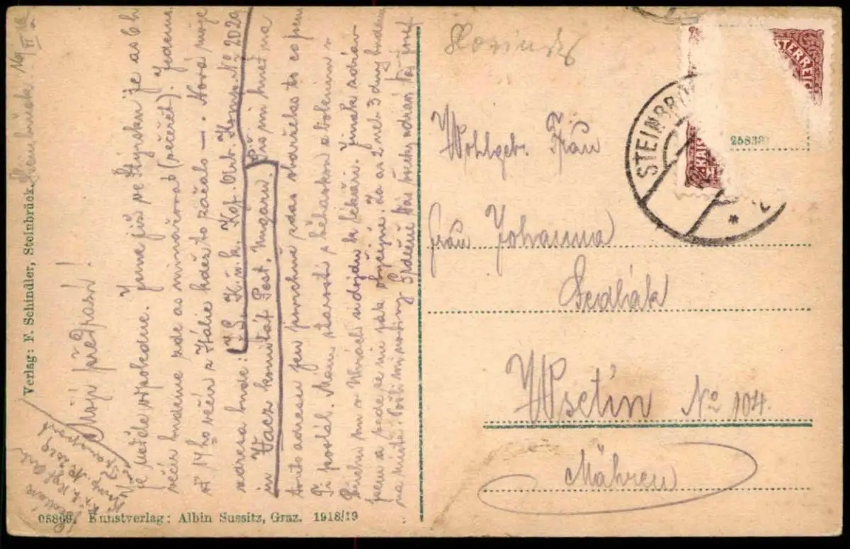 Gelaufen: xx.06.1918 mit Stempel Steinbrück nach Wsetin Mähren, Briefmarke teilweise entfernt