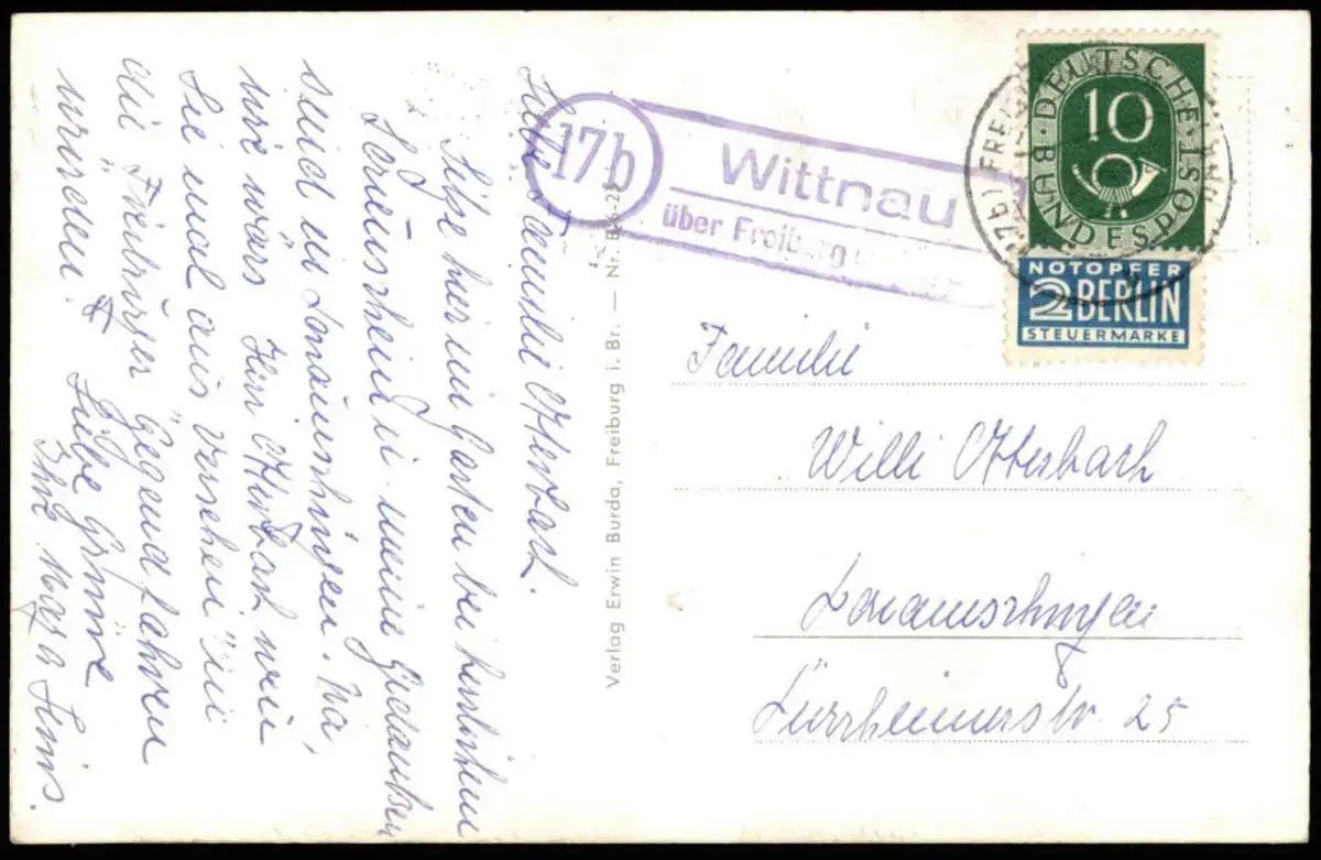Gelaufen: xx.xx.195x mit Stempel Wittnau 17b über Freiburg nach DonaueschingenErhaltung (s. Scan): gut / 917416