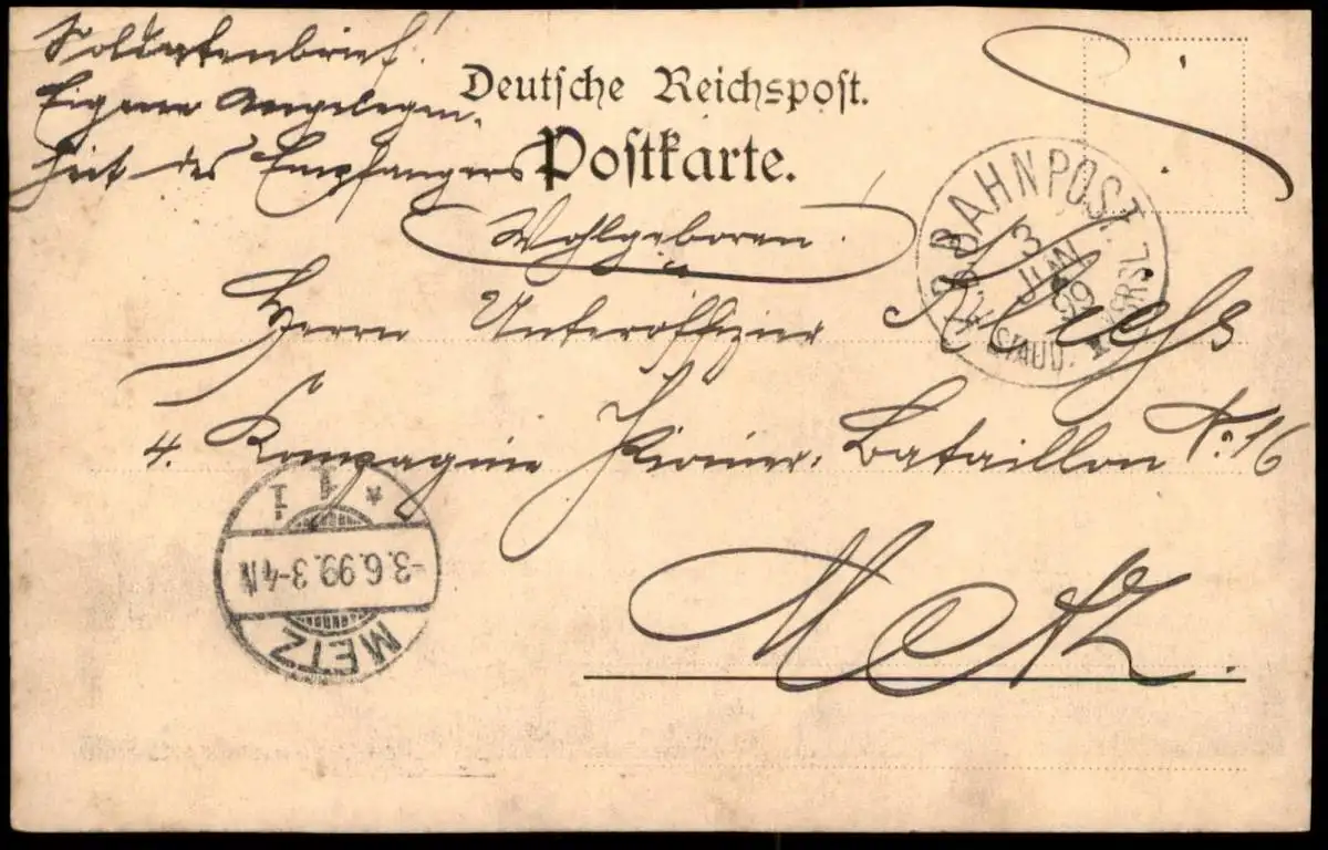 Gelaufen: 03.06.1899 mit Stempel K. B. Bahnpost nach MetzErhaltung (s. Scan): gut / 917398