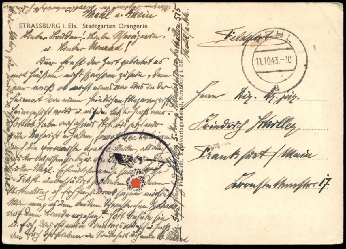 Gelaufen: 11.10.1943 als Feldpost mit Stempel Kehl nach Frankfurt am Main