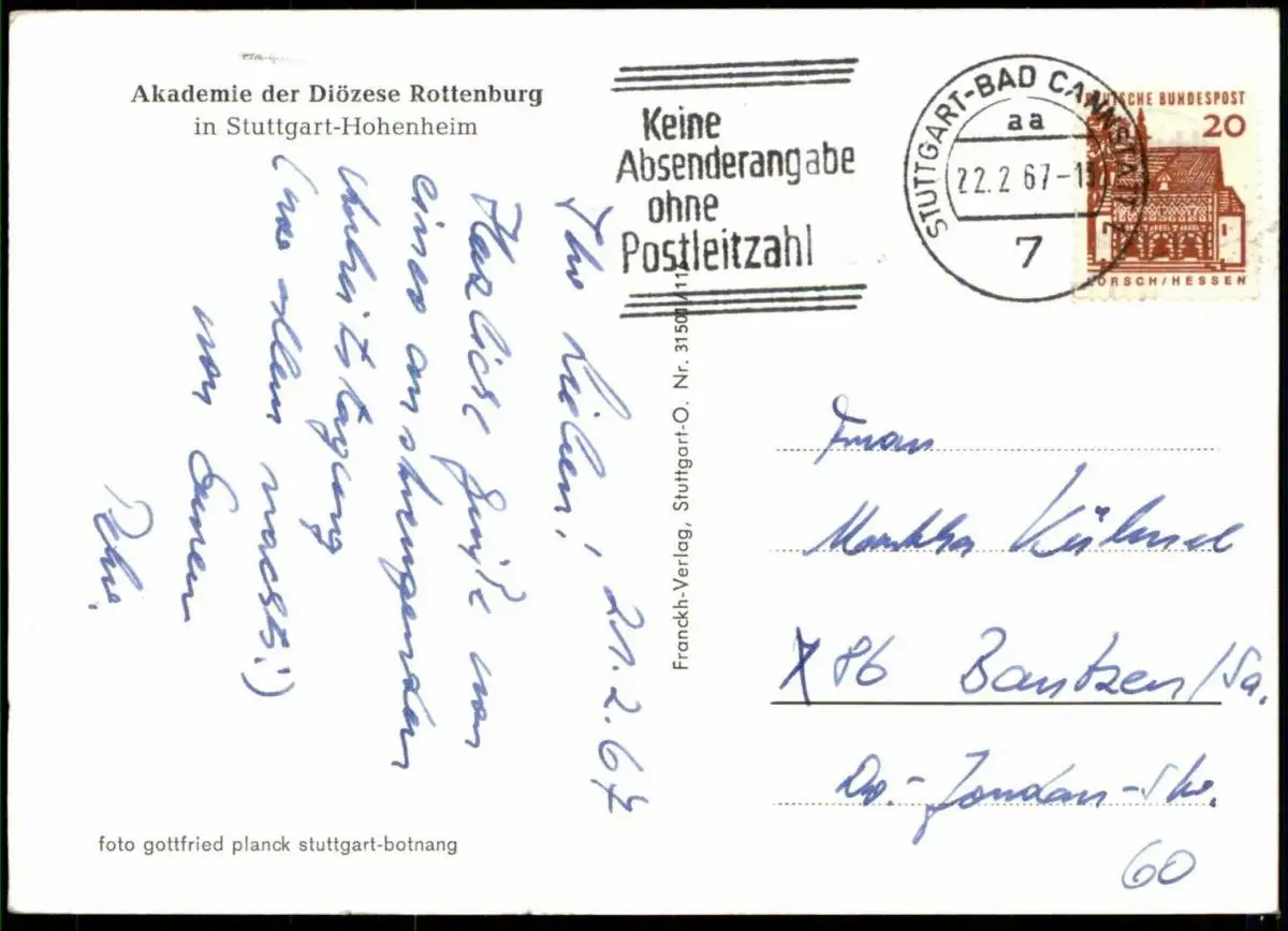 Gelaufen: 22.02.1967 mit Stempel Stuttgart Bad Cannstatt nach Bautzen