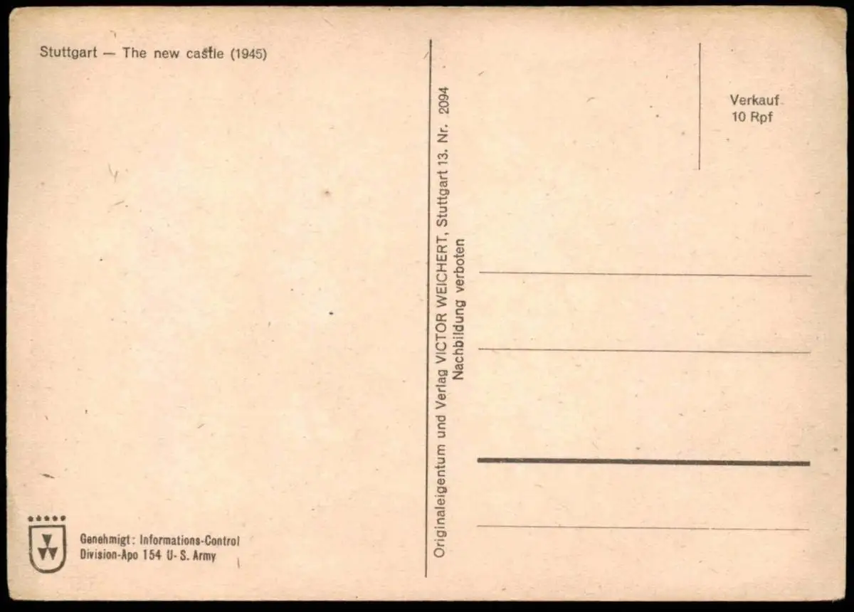 ALTE POSTKARTE STUTTGART NEUES SCHLOSS 1945 THE NEW CASTLEVerlag: Victor Weichert, Stuttgart, Genehmigt: Informations-Control Division Apo 154 U.S. Army