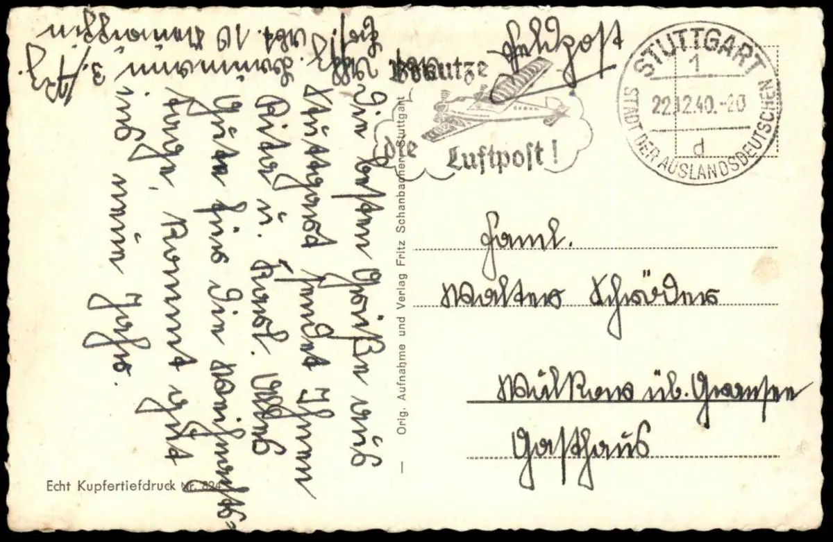 Gelaufen: 22.12.1940 mit Stempel Stuttgart „Benutze die Luftpost“