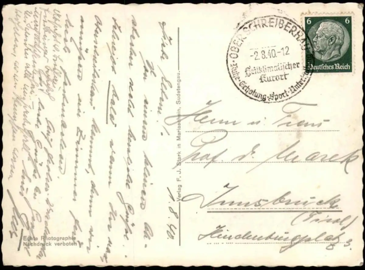 Gelaufen: 02.08.1940 mit Stempel Oberschreiberhau nach Innsbruck