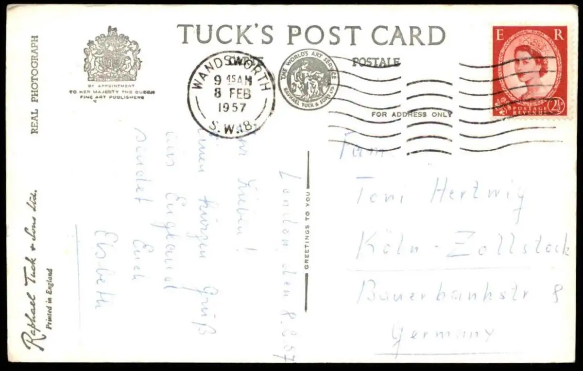 Gelaufen: 08.02.1957 mit Stempel Wandworth nach Köln-Zollstock