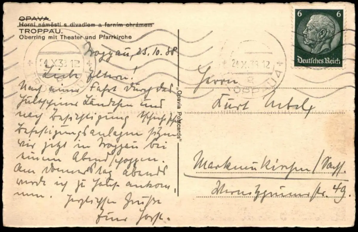 Gelaufen: 24.10.1938 mit Stempel Troppau nach Markneukirchen