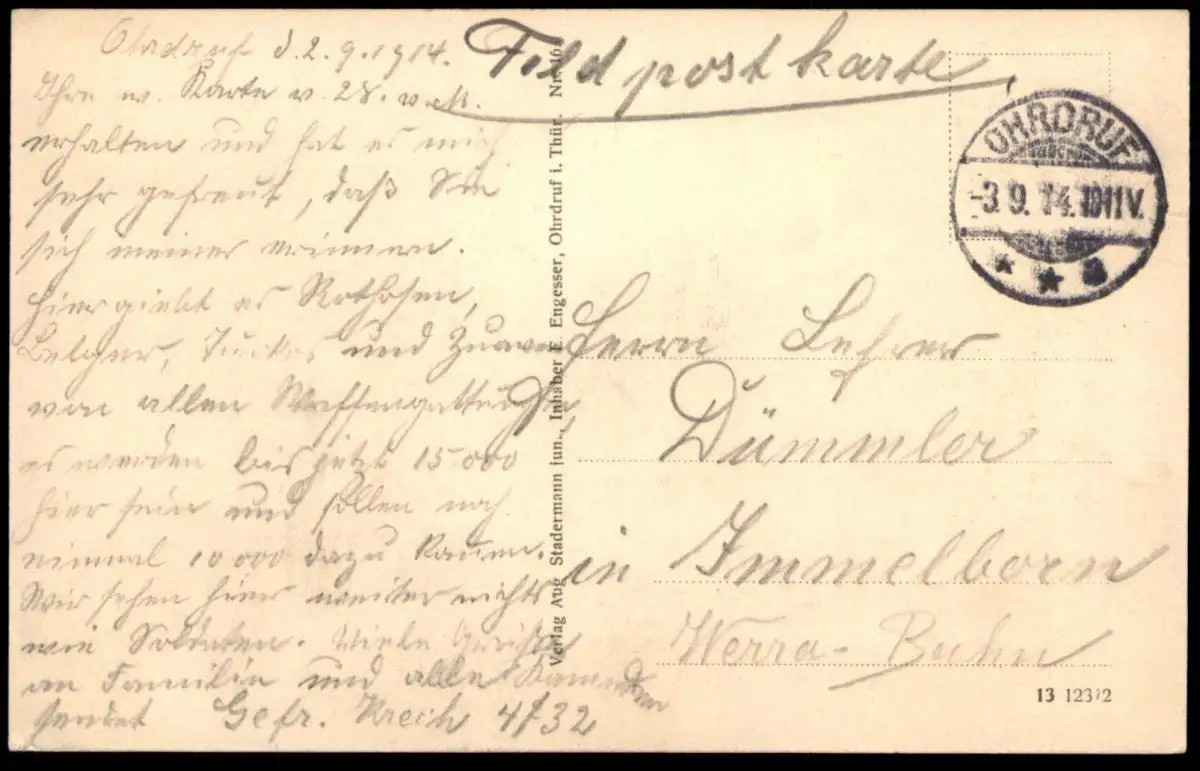 Gelaufen: 03.09.1914 mit Stempel Ohrdruf als Feldpost nach Immelborn