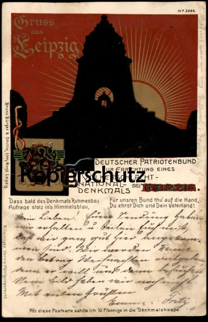 ALTE POSTKARTE VÖLKERSCHLACHTDENKMAL GRUSS AUS LEIPZIG PATRIOTENBUND Teufel Bruno Bürger & Ottillie Ansichtskarte cpa