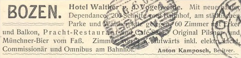 Rückseitig: Hotel Walther von der Vogelweide. Mit neuerbauter Dependance, 200 Schritte vom Bahnhof, am städtischen Parke und Waltherplatz gelegen, 60 Zimmer mit Erker und Balkon, Pracht-Restaurant und Café-Saal. Original Pilsner und Münchner Bier vom Faß. Zimmer von 2 K. aufwärts inkl. elektr. Licht, Commissionär und Omnibus am Bahnhof. Anton Kamposch, Besitzer