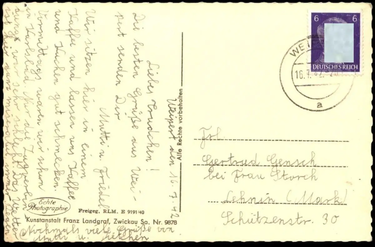 Gelaufen: 16.07.1942 mit Stempel Weipert nach Lehnin Mark