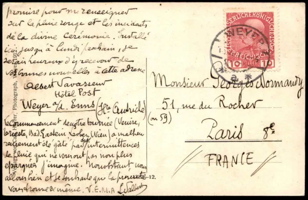 Verlag: Carl Harrer, Photograph, Weyer 1912Gelaufen: 16.07.1913 mit Stempel Weyer nach Paris von Verfasser Albert Vavasseur (Soldat) an Georges Normandy (Dramaturge)Erhaltung (s. Scan): gut, Ecke oben rechts sowie oben mittig minimal bestoßen / 917311