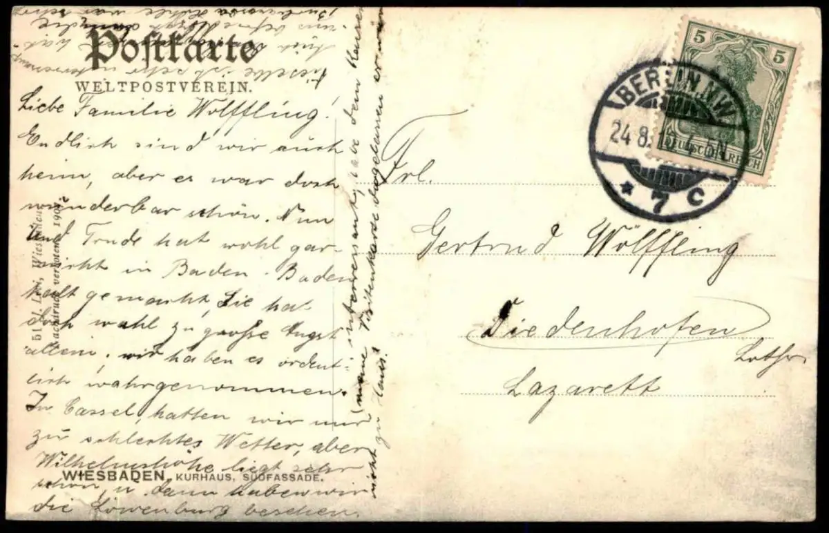 Gelaufen: 24.08.1910 mit Stempel Wiesbaden nach Diedenhofen