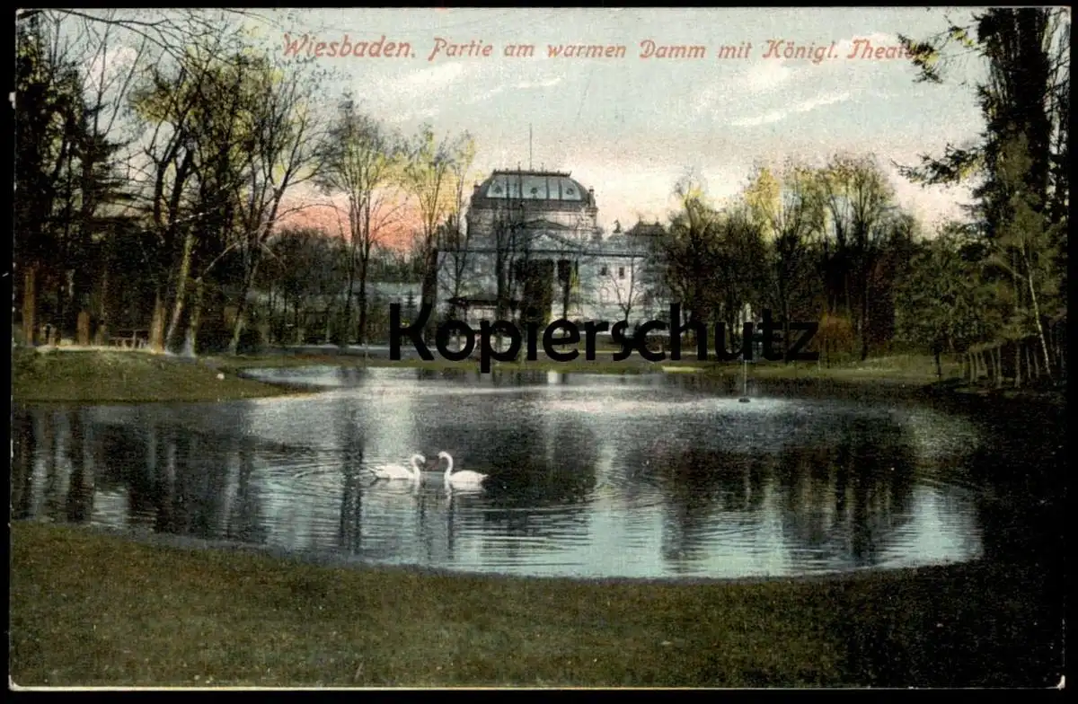ALTE POSTKARTE WIESBADEN PARTIE AM WARMEN DAMM MIT KÖNIGLICHEM THEATER SCHWAN SCHWÄNE PARK parc Ansichtskarte postcard