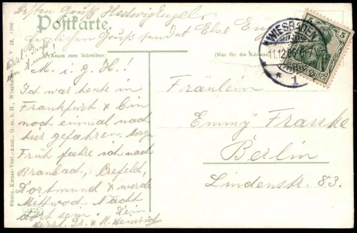 Gelaufen: 11.12.1906 mit Stempel Wiesbaden nach Berlin