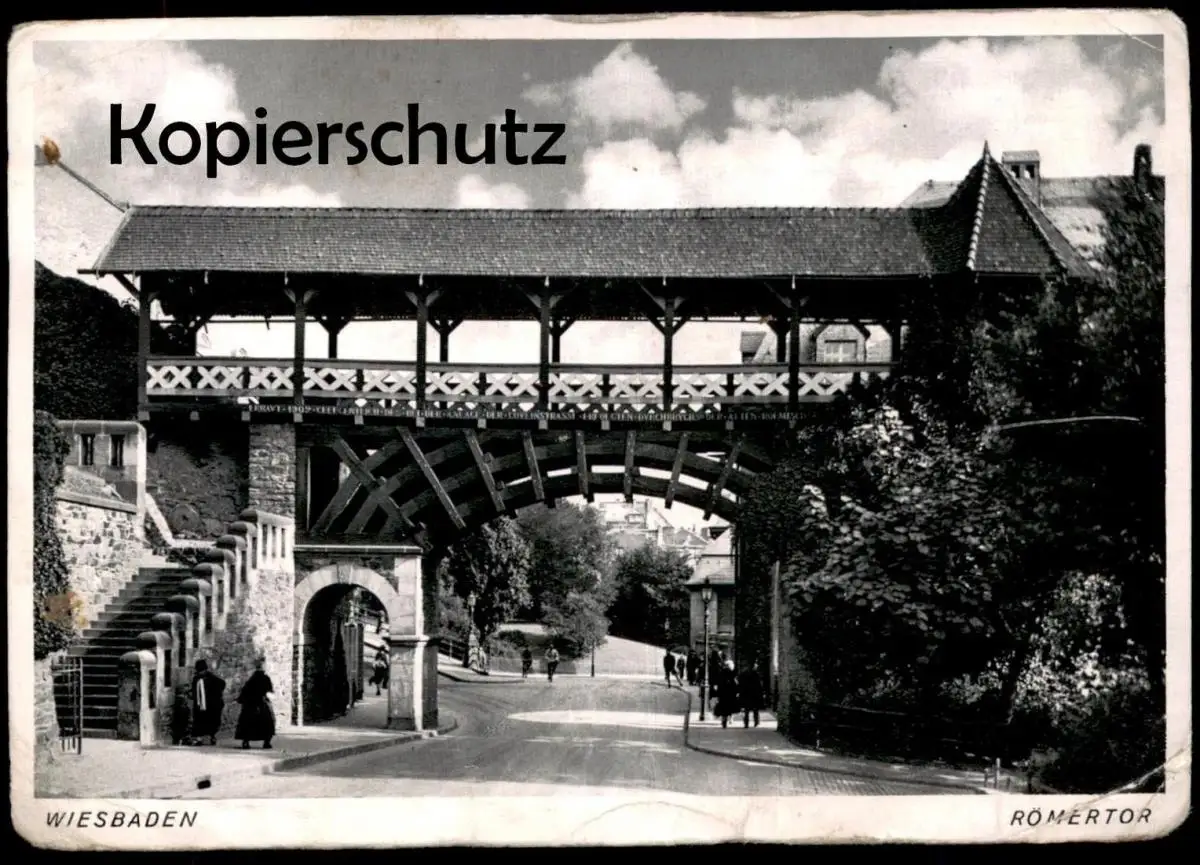 ALTE POSTKARTE WIESBADEN RÖMERTOR FUSSGÄNGER verm. 40er Jahre Tor gate porte Stadttor AK Ansichtskarte cpa postcard