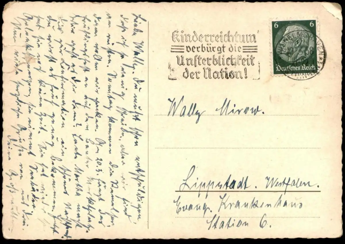 Verlag: unbekanntGelaufen: 10.03.1938 mit Propagandastempel Wilhelmshaven "Kinderreichtum verbürgt die Unsterblichkeit der Nation" nach Lippstadt Westfalen, Evangelisches Krankenhaus Station 6Erhaltung (s. Scan): schlechter, obere Ecken bestoßen, rechtsseitig oben stärker beschädigt mit kleinen Einrissen / 916493