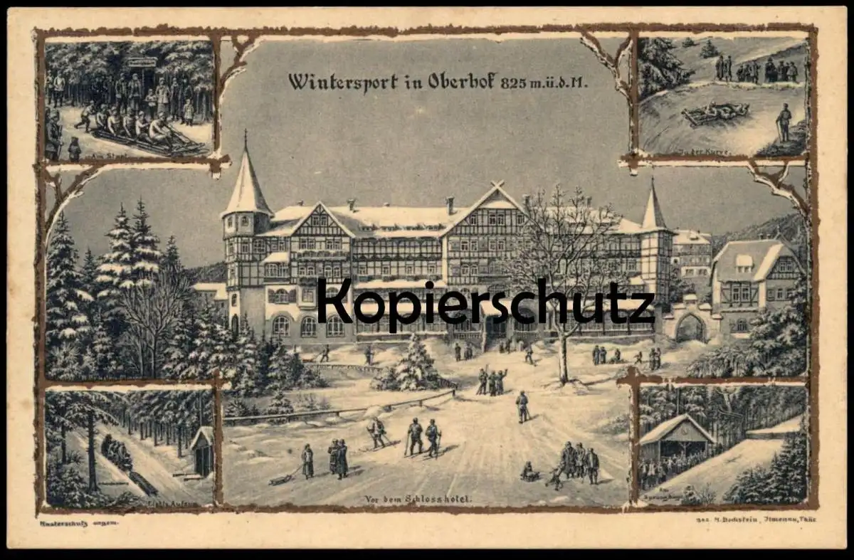 ALTE POSTKARTE WINTERSPORT IN OBERHOF BOB SLEIGH SCHLITTEN AM START IN DER KURVE ELEKTRISCHER AUFZUG SKISPRUNG VOR DEM SCHLOSSHOTELVerlag: Verlag der vereinigten Sportgeschäfte, Oberhof; gezeichnet Max Bechstein, Ilmenau