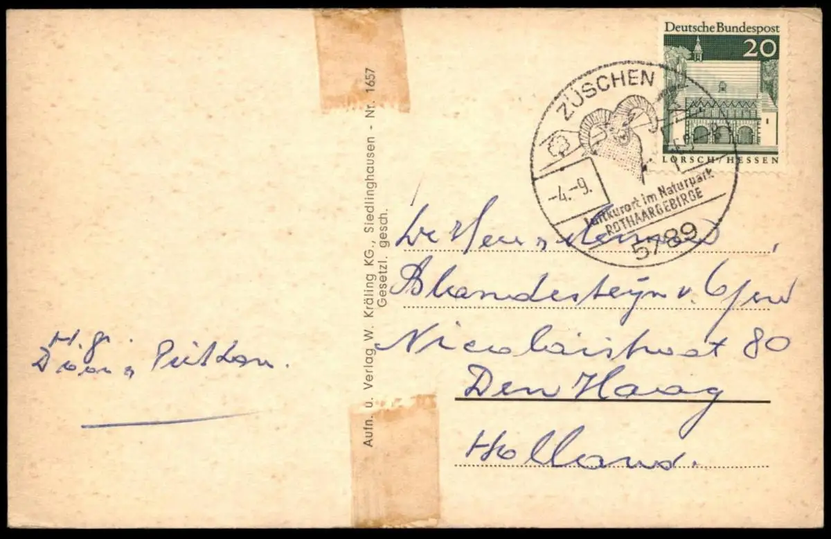Gelaufen: 04.09.1959 mit Stempel Züschen nach Den HaagErhaltung (s. Scan): gut - mittel, rückseitig zwei Spuren von Klebestreifen (nicht klebend) / 915173