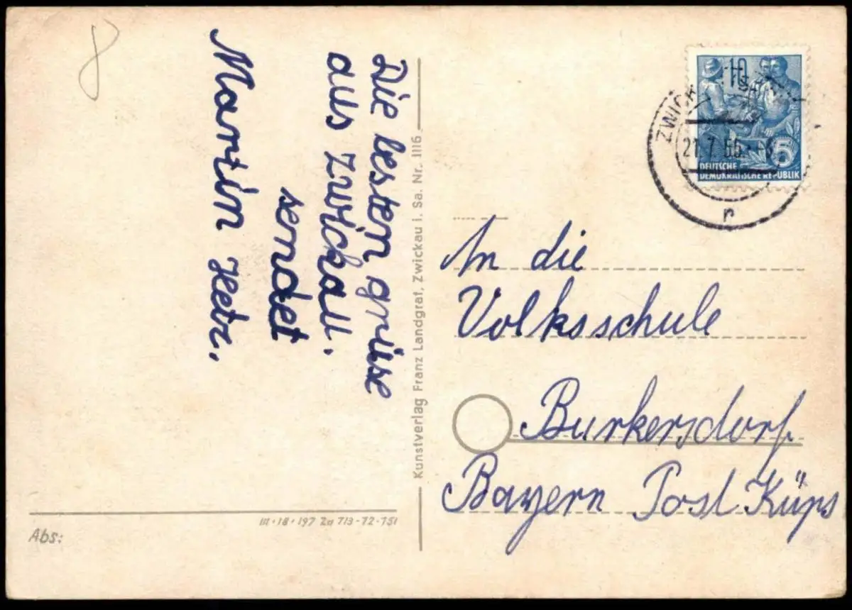 Gelaufen: 21.07.1955 mit Stempel Zwickau nach BurkersdorfErhaltung (s. Scan): gut, obere rechte Ecke leicht bestoßen / 915182