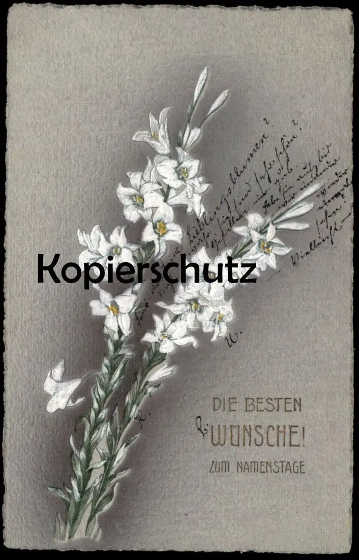 ALTE PRÄGE POSTKARTE DIE BESTEN WÜNSCHE ZUM NAMENSTAGE WEISSE LILIEN 1913 lily Lilie lis lys embossed cpa gauffrée AK
