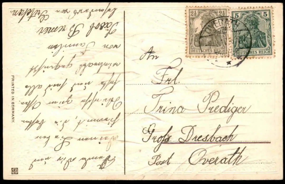 Gelaufen: 07.04.1910 mit Stempel Overath nach Grossdresbach