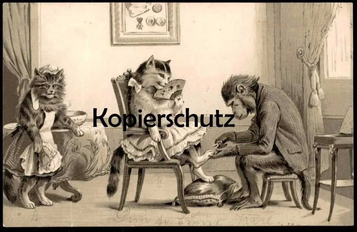 ALTE PRÄGE POSTKARTE KATZE VERMENSCHLICHT AFFE PEDIKÜRE monkey ape singe cat cats chat chats Katzen postcard cpa AK