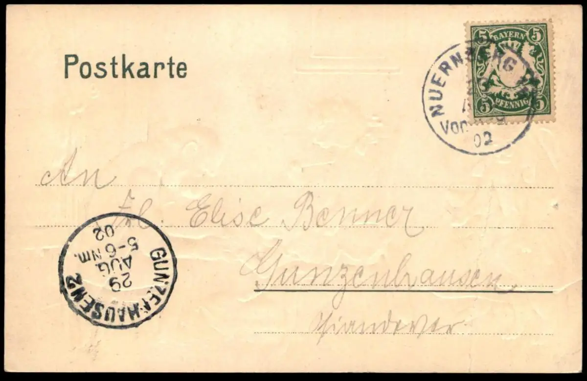 Gelaufen: 29.08.1902 mit Stempel Nürnberg nach Gunzenhausen