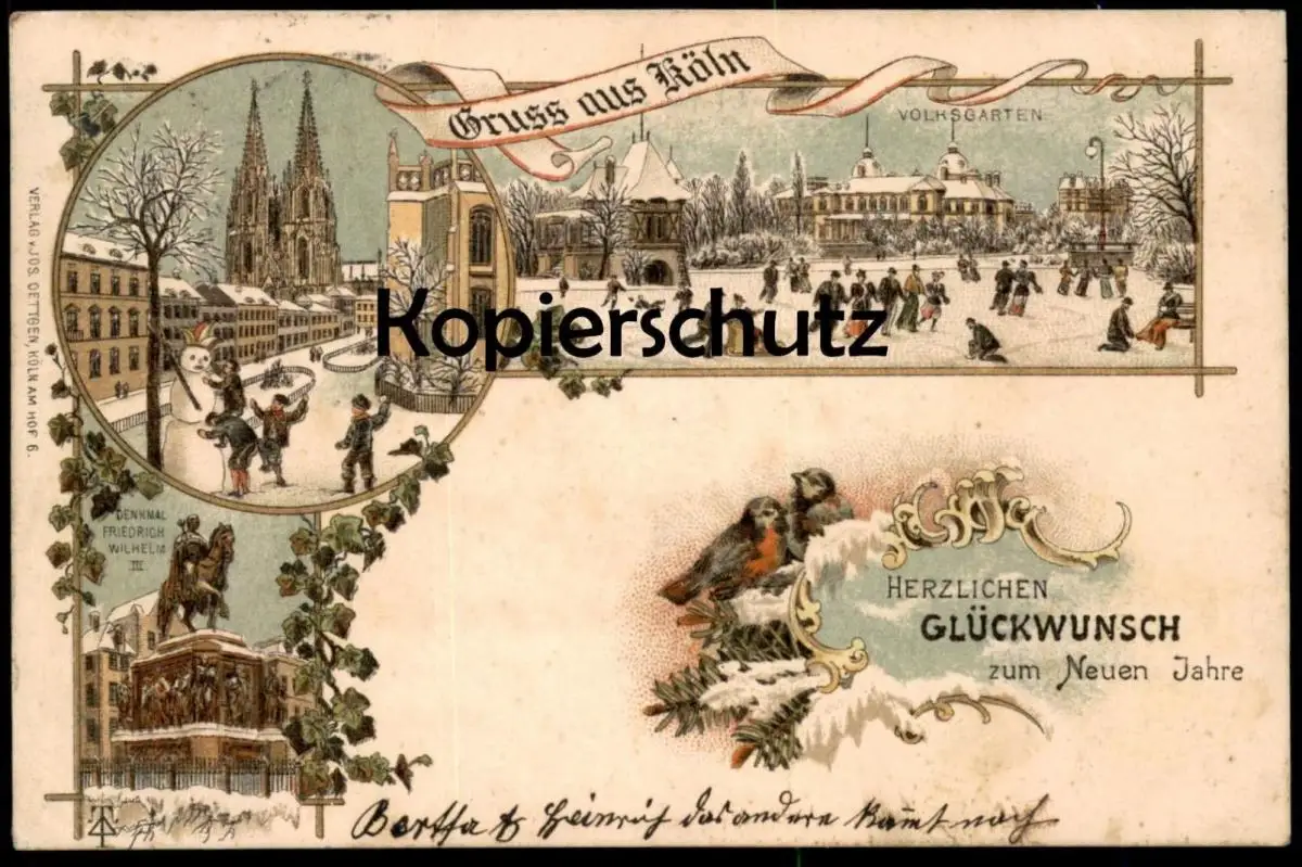ALTE WINTER LITHO POSTKARTE GRUSS AUS CÖLN HERZLICHEN GLÜCKWUNSCH ZUM NEUEN JAHRE EISLAUFEN VOLKSGARTEN DENKMAL FRIEDRICH WILHELM III. SCHNEEMANNVerlag: Jos. Oettgen, Köln, Am Hof 6