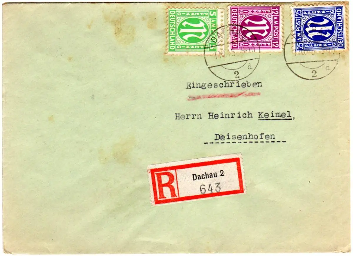 AM Post 1945, 5+12+25 Pf. auf Einschreiben Brief v. Dachau 2 n. Deisenhofen