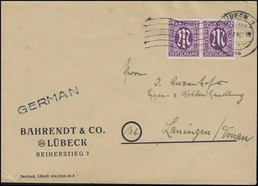 AM-Post 2x 12 Pf. MeF Fern-Brief LÜBECK 1 bb - 9.7.46 nach Lauingen
