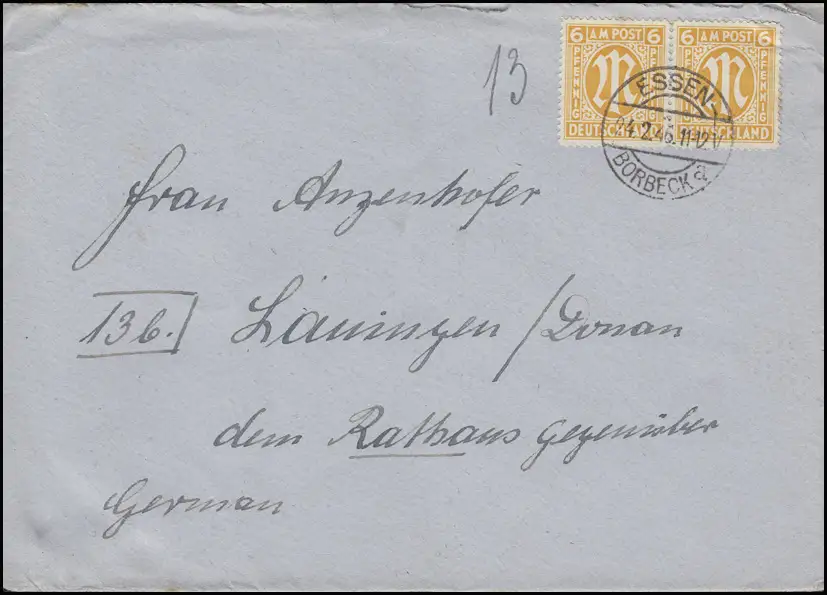 AM-Post 2x 6 Pf. MeF Fern-Brief ESSEN-BORBECK a - 24.2.46 nach Lauingen/Donau