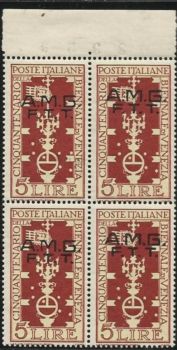 Biennale von Venedig Lire 5 mit stark falsch ausgerichtetem Aufdruck Vollgummi - Biennale von Venedig Lire 5 Nr. 35 Viertel mit stark falsch ausgerichtetem Aufdruck zwischen den Exemplaren rechts und links - Interessant, nicht katalogisiert Code 744/7