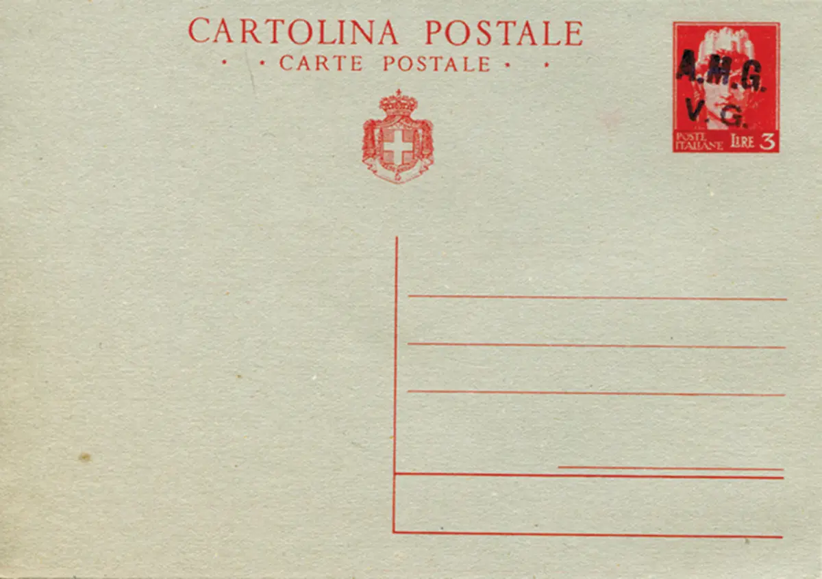 AMG. Sehr guter Zustand. - CP Lire 3 Turrita lila Handaufdruck Postkarte - AMG. Sehr guter Zustand. - CP Lire 3 Turrita Handaufdruck lila (Kat. Interitalia Nr. 130) - neu in sehr gutem Erhaltungszustand Cod. 1189/14