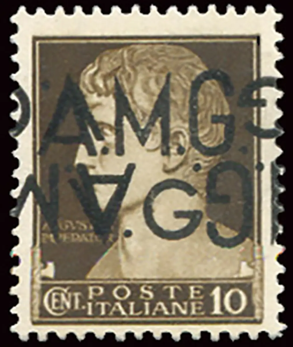 AMG. Sehr guter Zustand. - Cent. 10 Sorten Doppelaufdruck davon eine umgedrehte Vollgummi - MHN - - AMG. Sehr guter Zustand. - Cent. 10 n. 1 Doppelaufdruck, davon eine umgedreht und stark nach rechts verschoben (M zu Pferd) - Selten - Kat. euro 850 Cod. 994/14