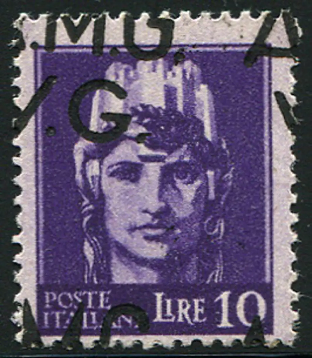 Vollgummi - AMG. Sehr guter Zustand. - Lire 10 n. 11gea schönes Exemplar mit stark in beide Richtungen versetztem Aufdruck (4-eckig zu Pferd) - Unzitiert - Seltene Nr. 794/6