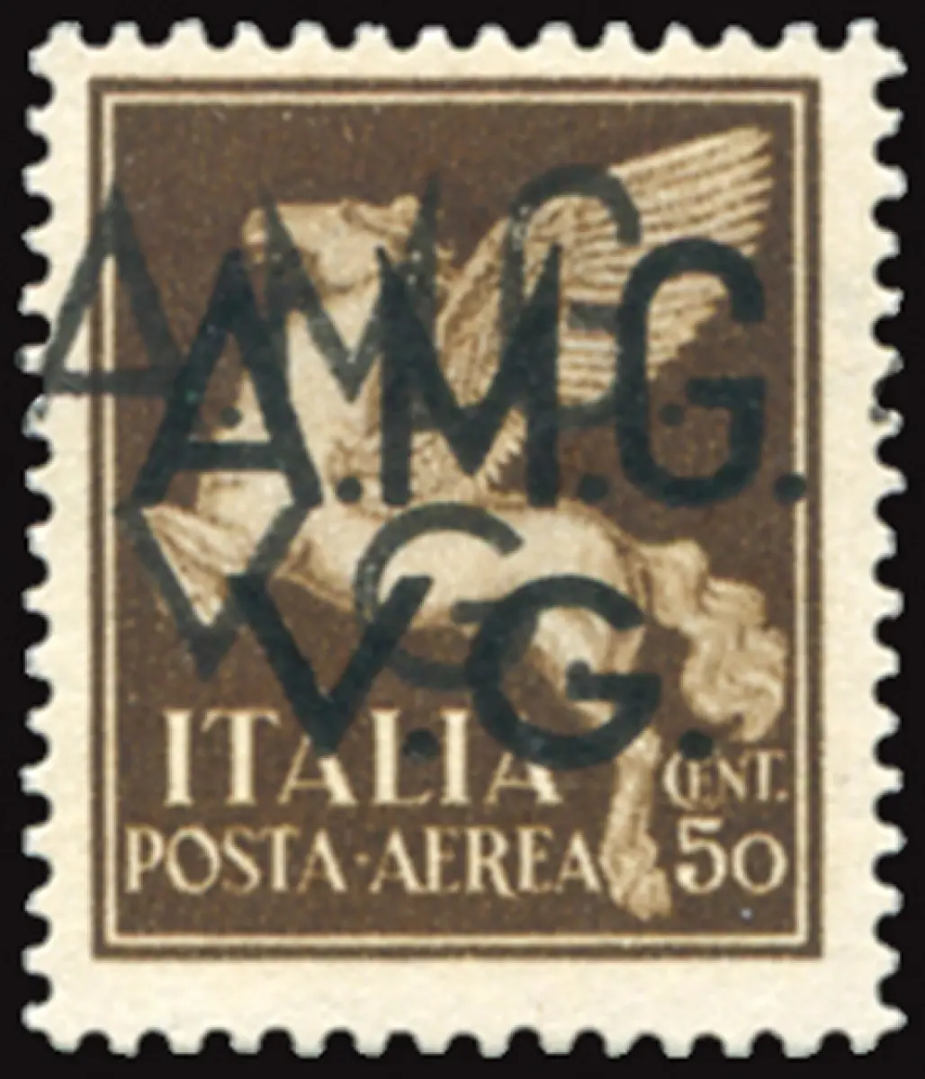 AMG. Sehr guter Zustand. - Luftpost ca. 50 Sorten mit doppeltem Vollgummi-Aufdruck MNH - AMG. Sehr guter Zustand. - Luftpost ca. 50 n. 1ca schönes Exemplar mit Doppelaufdruck, davon einer stark nach oben und links verschoben - Ungewöhnlich - Kat. euro 600 Cod. 942/16