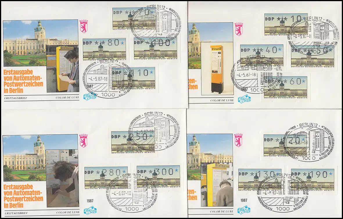 ATM Berlin 14 Werte 10-300 Pf - Satz auf 4 FIDACOS-FDC mit ESSt Berlin 4.5.1987