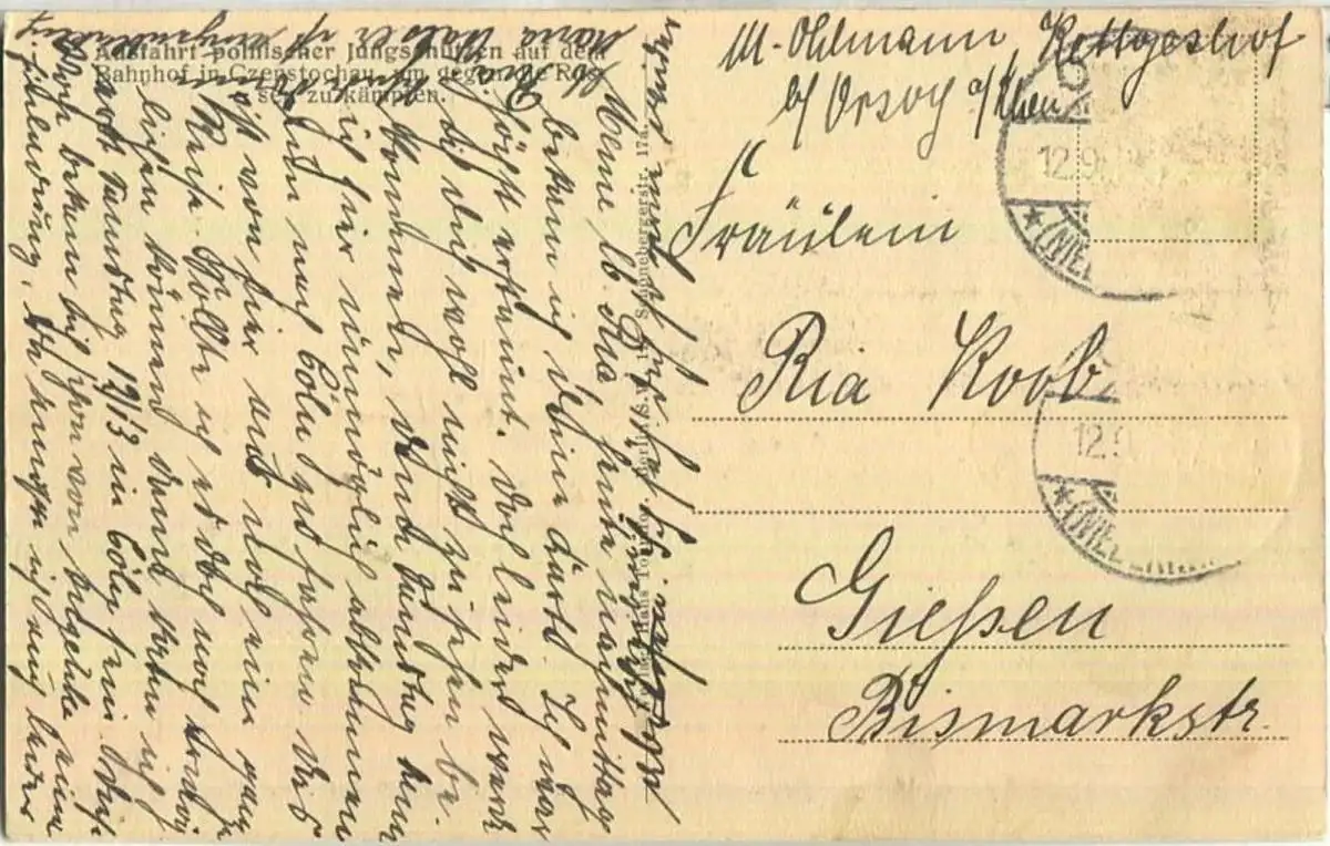 Abfahrt polnischer Jungschützen auf dem Bahnhof in Czenstochau um gegen die Russen zu kämpfen - Verlag Hans Tohmfor Berlin - Briefmarkern entfernt - Papierschaden auf der Vorderseite (E98478) gel. 1913