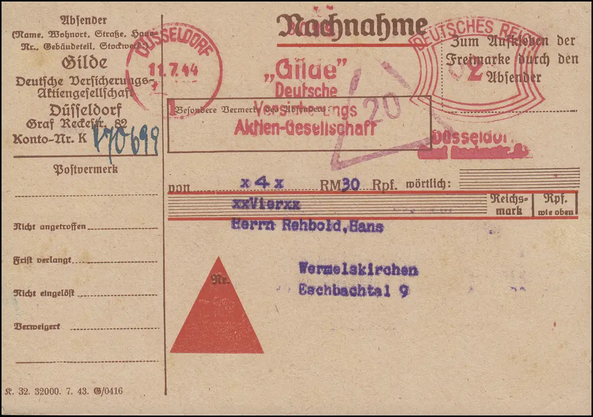 Absenderfreistempel auf Nachnahmekarte GILDE-Versicherung DÜSSELDORF 11.7.1944