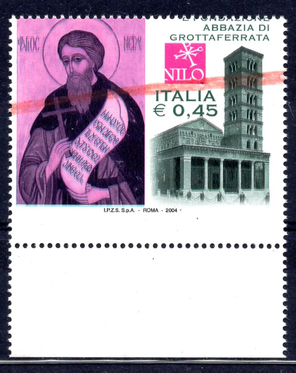Vollgummi - Abtei von Grottaferrata ohne Gelbdruck - Naturmarke San Nilo rosa mit stark verschobener horizontaler Verzahnung, so dass sie nicht auf die Aufschrift Millennium Tod San Nilo di Rossano steht - trägt wie alle Exemplare aus dem bekannten Blatt einen Bleistiftstrich des Prüfers - auffällig, Einheitlicher Katalog Nr. 2819Bd Euro 1.250,00 - Nr. 677/6