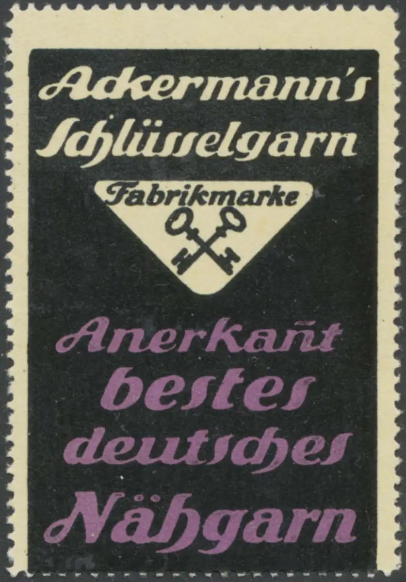 anerkannt bestes deutsches Nähgarn, Fabrikmarke, violett, Handarbeit, Größe/Zustand: 6x4 , guter Zustand, Original alte Reklamemarke die seinerzeit für die Werbung benutzt wurde