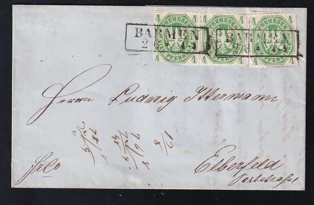 Adler 4 Pfge waager. Pqaar + Einzelmarke auf Brief mit R2 BARMEN 2.6. nach Elberfeld,