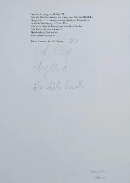 25 unpag. Blatt mit 4 signierten Originalgrafiken sowie einer weitern lose beiliegenden Grafik von Klaus Zylla. Illustrierter Originalkarton Einband im illustrierten Original Karton. Format: 29,5 x 21 cm. Nr.22 von 22 numerierten und im Colophon von Gerd Adloff, Klaus Zylla und Hendrik Liersch signierten Exemplaren. Sehr schönes Exemplar mit zwei handschriftlichen Gedichten von Gerd Adloff. Fast alle Gedichte als Erstveröffentlichung. Druck der Radierungen von Dieter Béla. Einband und Karton in Handbindung von Stefan Cseh.