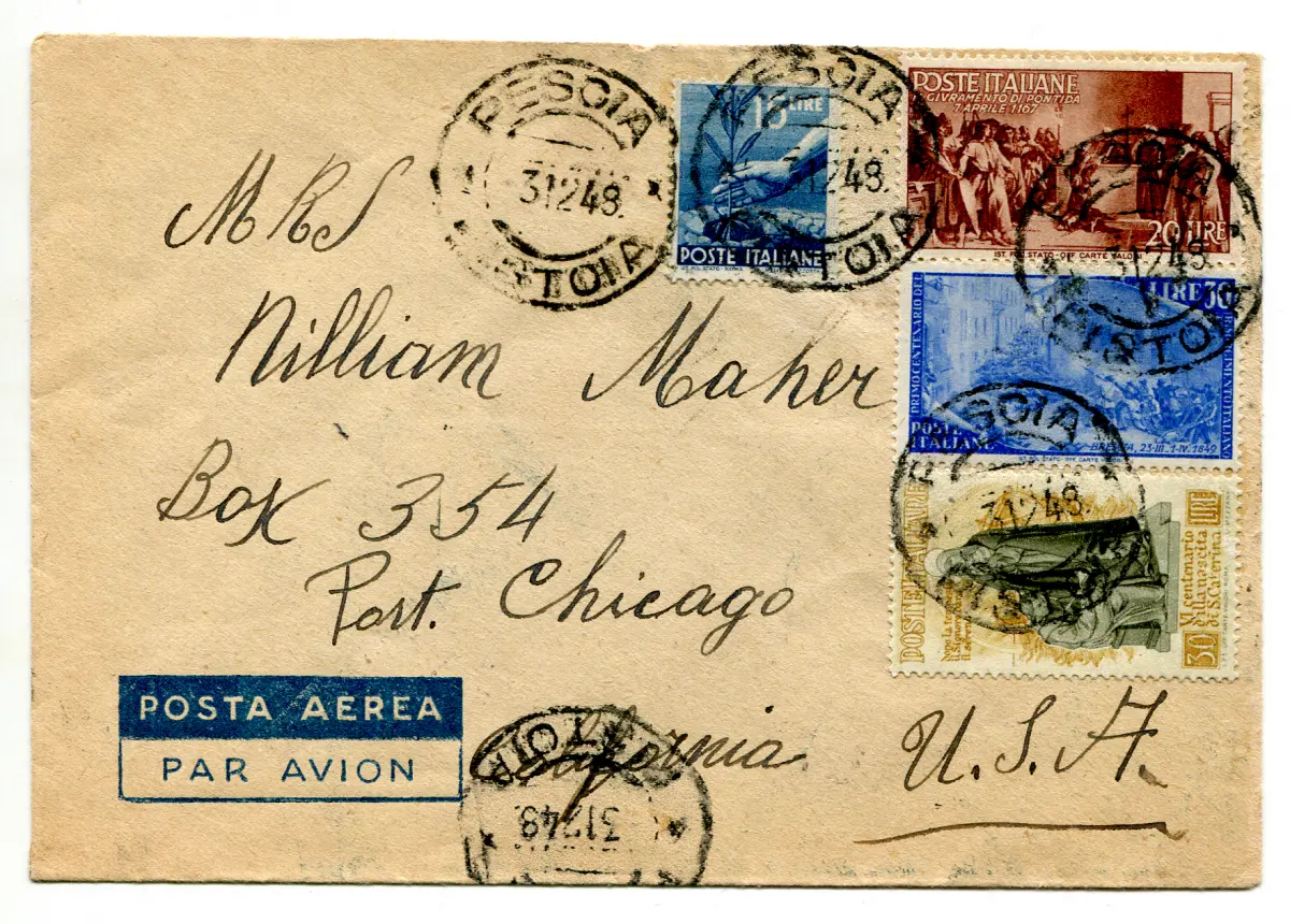 Advent Lire 20 auf Luftumschlag Umschlag - Advent Lire 20 Nr. 573 + Ergänzungen Nr. 560 + 577 + 589 auf Luftumschlag für die USA am 3.12.48 - wertvolle Verwendung im Tarif von Zwillingswerten ab Lire 30 - nicht philatelistische Postnutzung Cod. 249/13