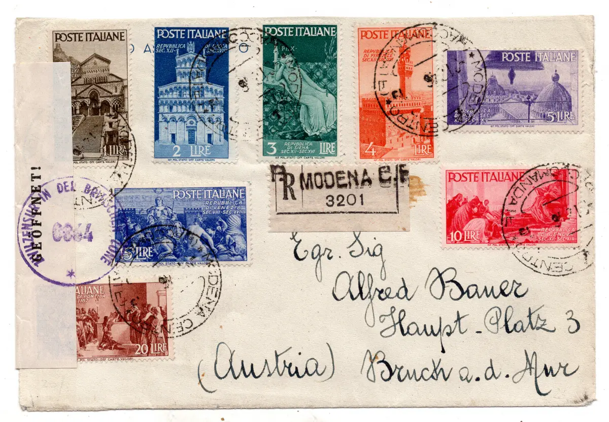 BÜSTE - Advent der Republik Nr. 566/573 komplette Serie auf Umschlag Racc. für Österreich am 3.12.46 - neben Jahrgang und Zensurband, auf der Rückseite als erinnofilo Briefschließer Pro Victime Politices Lire 2 Col. Montezemolo - angenehm und ungewöhnlich Cod.404/182